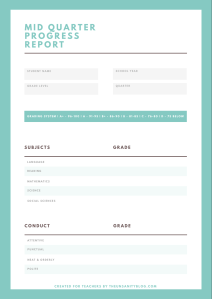 Readers, I have something different for you today regarding Freebies! I decided to make something for the teachers that follow me (I know there are a few of you!) Instead of a “report card”, I made a mid quarter progress report that you can print out to give to the parents of your children. I know report cards are regulated by the school system, and this is an easy way to let the parents and guardians know how their children are doing after a few weeks in classes to see what they may need to improve on to get that A or B in the class for the report card!
